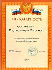 Компания ООО «ЕЛАННА» благодарит Генерального директора ООО СПК «ВАНДА» Желудева Андрея Валерьевича, менеджера Боброва Дмитрия Николаевича, за своевременное поставку и качественную сборку, монтаж и постройку, а так же за своевременную сдачу объекта, предоставление документации на помещение модульного одноэтажного этажного здания площадью 180 кв.м, под единой крышей по адресу: г.Сергиев-Посад, Новоугличское шоссе78, магазин Строительных материалов, кровли, фасадов.