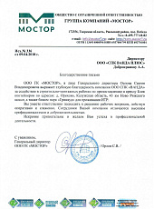 ООО ГК "МОСТОР", в лице Генерального директора Орлова Сергея Владимировича выражает глубокую благодарность компании ООО СПК "ВАНДА" за содействие в строительно-монтажных работах по предоставлению в аренду Блок контейнеров по адресам: д. Орехово, Калужская область, 43 км. Ново Рижского шоссе, а также бизнес парк "Гринвуд", для проживания ИТР.